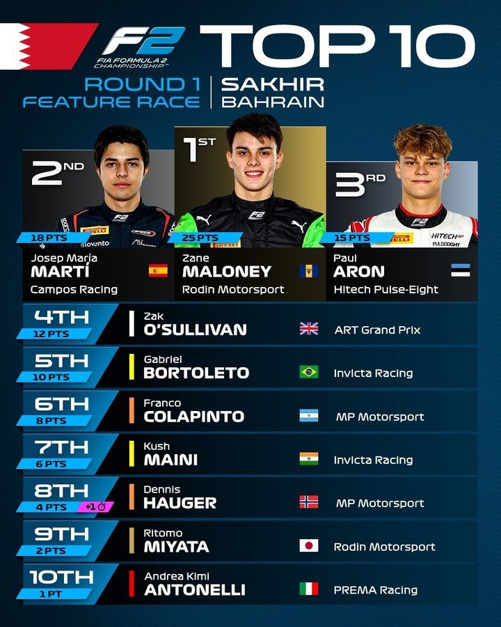 El barbadense Zane Maloney (Rodin Motorsport), vencedor de la carrera de velocidad en la jornada anterior, repitió este sábado su victoria con un tiempo de 1:02:46.435 para cubrir las 32 vueltas al Circuito Internacional de Bahréin, en Sakhir.