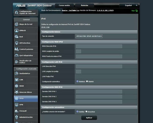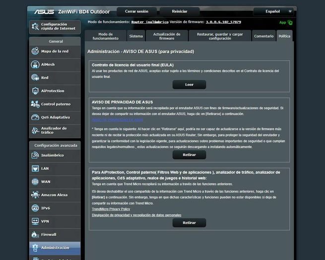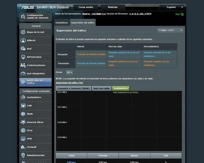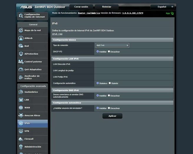 El firmware Asuswrt en este sistema Wi-Fi Mesh de exterior dispone de las mismas funcionalidades de siempre, en este aspecto, nada ha cambiado y tenemos la mayoría de funciones y características habituales. No obstante, ten presente que lo normal es usar este equipo como nodo AiMesh, y no como router AiMesh.