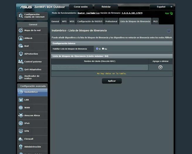 En la pestaña de «Lista de bloqueo de itinerancia» es donde podemos dar de alta una dirección MAC con el objetivo de bloquear su roaming, de esta forma, los dispositivos estáticos como una Smart TV o consola, no hará roaming si se encuentra entre dos nodos, perfecto para evitar posibles cortes. En la pestaña de «MLO» es donde podemos habilitar esta función y añadir la red secundaria o principal para usar esta característica tan importante.