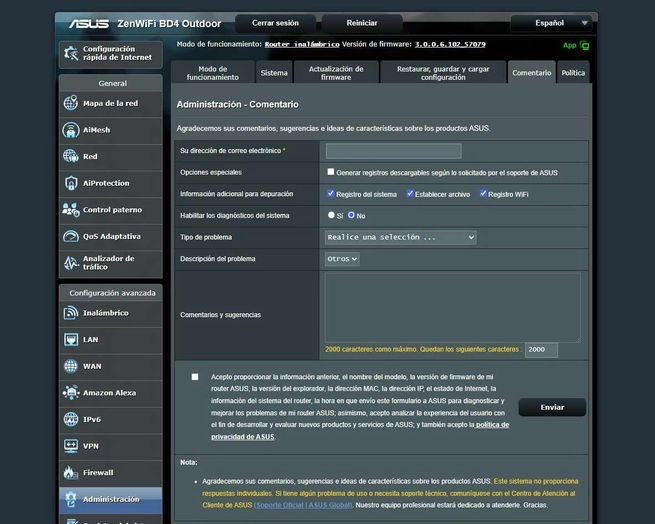 En la pestaña de «Comentario» es donde podemos generar un registro de todo lo que ha pasado en el router, y reportar algún problema directamente a ASUS. También podemos revisar la política de privacidad de ASUS y del AiProtection.
