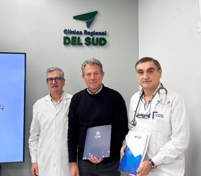 La firma del convenio contó con la presencia de Roque Lenti, CEO de GNI; Norberto Fabián Bruno, vicepresidente de Clínica Regional del Sud; y Gustavo Guillermo del Cantare, vocal titular y director de la institución médica.