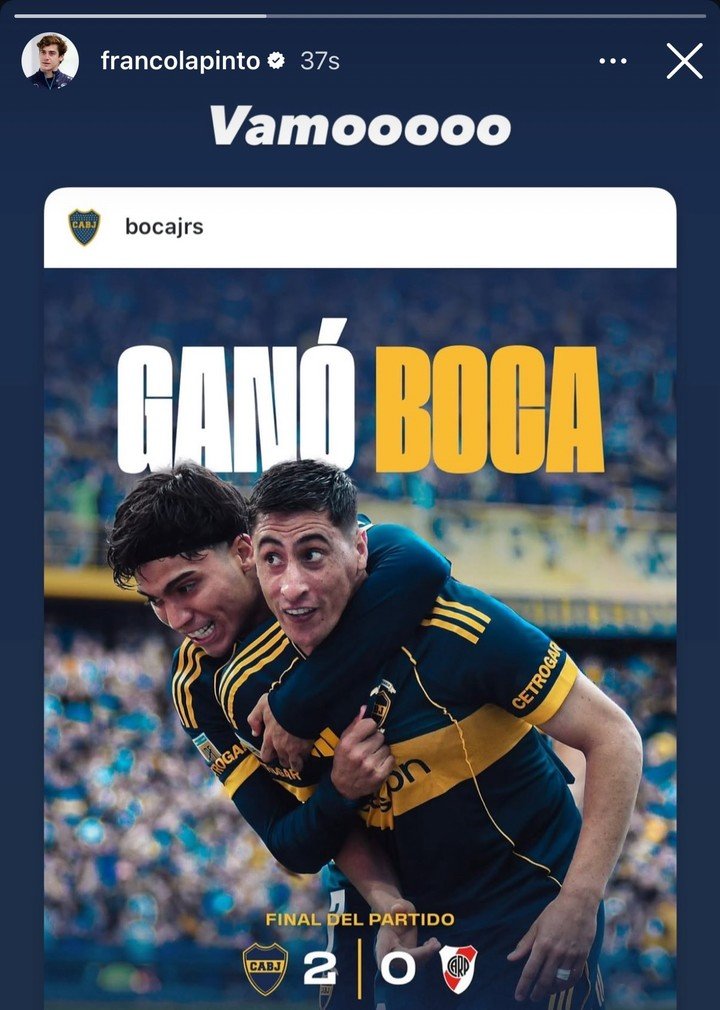 La historia de Franco Colapinto para celebrar el triunfo de Boca ante River en el superclásico. (IG)La historia de Franco Colapinto para celebrar el triunfo de Boca ante River en el superclásico. (IG)