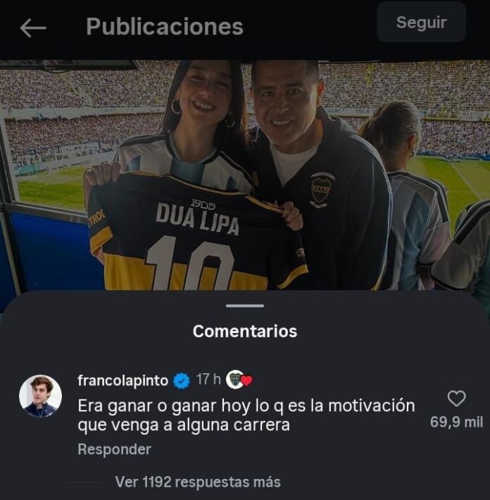 Colapinto comentó esa misma publicación y le hizo un pedido a Dua Lipa: ” Era ganar o ganar hoy… Lo que es la motivación. Que venga a alguna carrera“. Su comentario rápidamente fue furor y alcanzó las 1.260 respuestas y los 81 mil me gustas, incluyendo el de la cuenta del equipo de La Ribera.