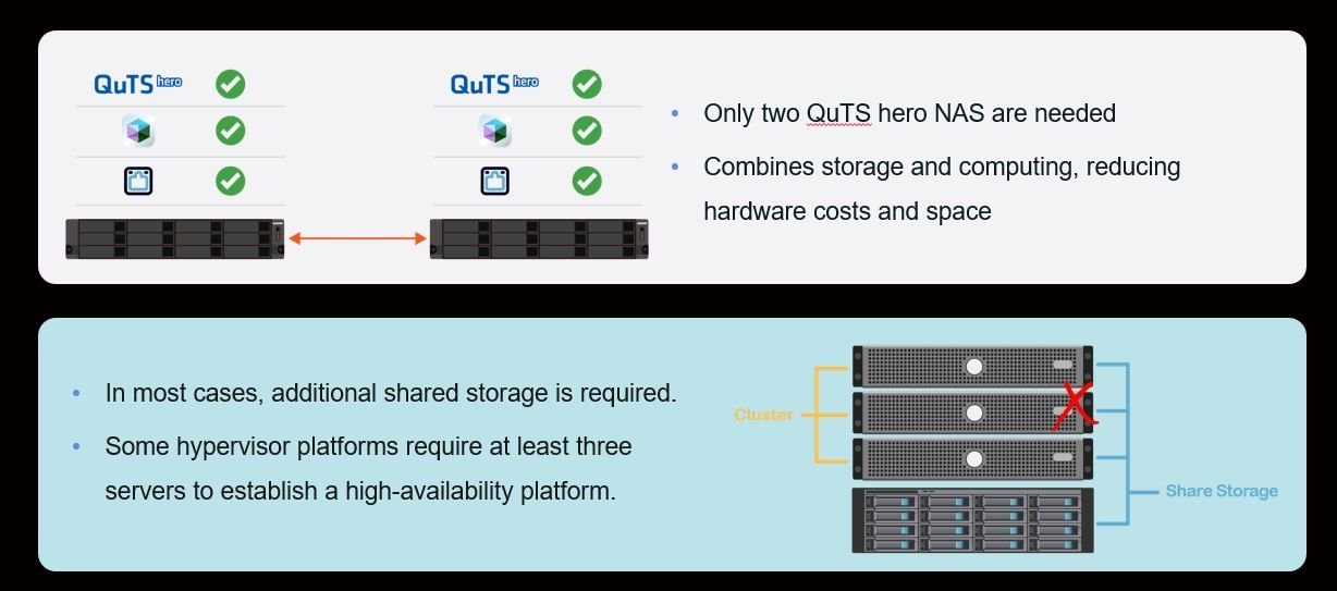 En cuanto a la alta disponibilidad de Virtualization Station, en este caso solamente necesitaremos dos NAS con QuTS hero y la misma marca de procesador (Intel o AMD), no es necesario que tengamos el mismo NAS ni el mismo hardware. Gracias a esta nueva funcionalidad del software de virtualización, podremos seguir con nuevas VM levantadas sin ningún tipo de interrupción. Además, un aspecto importante es que no necesitaremos un «almacenamiento compartido» con los NAS, como ocurre con otras soluciones.