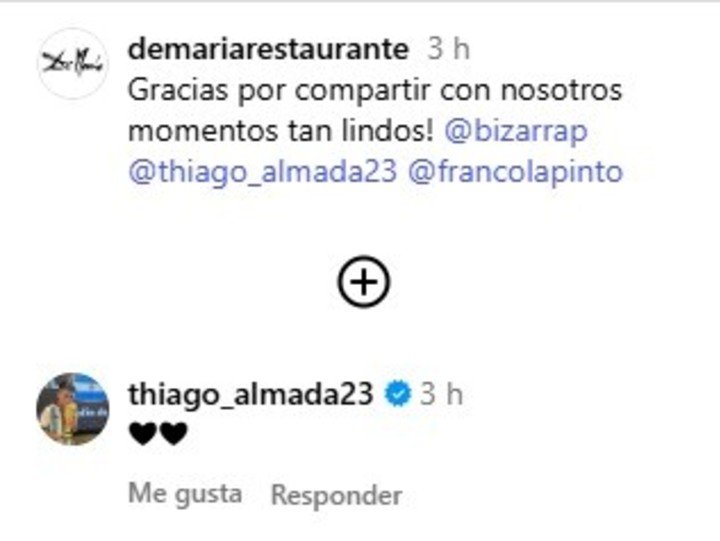 El mundo de la música, el fútbol y el automovilismo se cruzó en un restaurante muy famoso de España. Franco Colapinto, Bizarrap y Thiago Almada, tres cracks de la actualidad, se juntaron en De María, un establecimiento gastronómico especializado en carne a la parrilla, al que asistieron personalidades nacionales como Julián Álvarez, Franco Mastantuono y Ricardo Darín, entre otros.