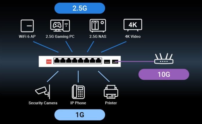 Las principales características de este nuevo switch ASUS QG-U1080 no gestionable, es que incorpora un total de 8 puertos 2.5G Multigigabit para la LAN, esto significa que los clientes cableados podrán sincronizarse a velocidades de 2.5Gbps, 1Gbps, y 100Mbps, perfecto para adaptarse a cualquier tipo de tarjeta de red o dispositivo que conectemos. Otro aspecto muy importante, es que tenemos 2 puertos 10G SFP+ para enlaces ascendentes (el que se conecta al router) a través de cable de fibra (o usar cables DAC), además, la velocidad de estos puertos es de 10Gbps o 1Gbps. Gracias a estos puertos tan rápidos, tendremos la posibilidad de tener una velocidad Multigigabit real en nuestro hogar, y todo ello sin necesidad de realizar complejas configuraciones.