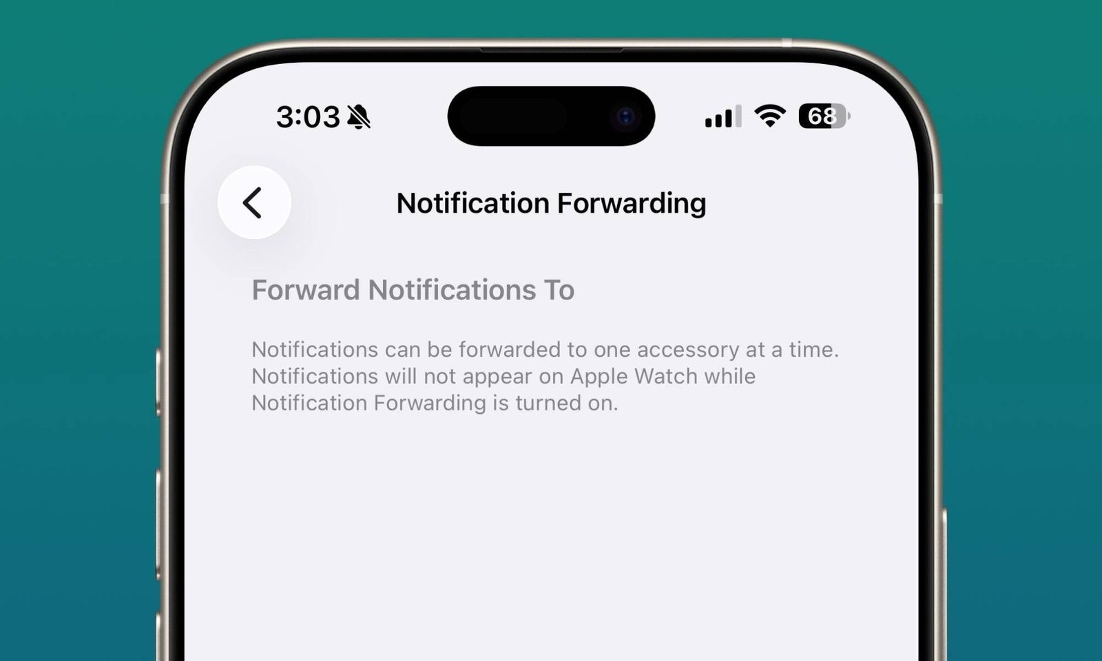 La descripción de la función señala que solo un dispositivo portátil puede recibir notificaciones reenviadas a la vez. También añade que cuando el reenvío de notificaciones está activado, las alertas dejarán de aparecer en un Apple Watch conectado al mismo iPhone.