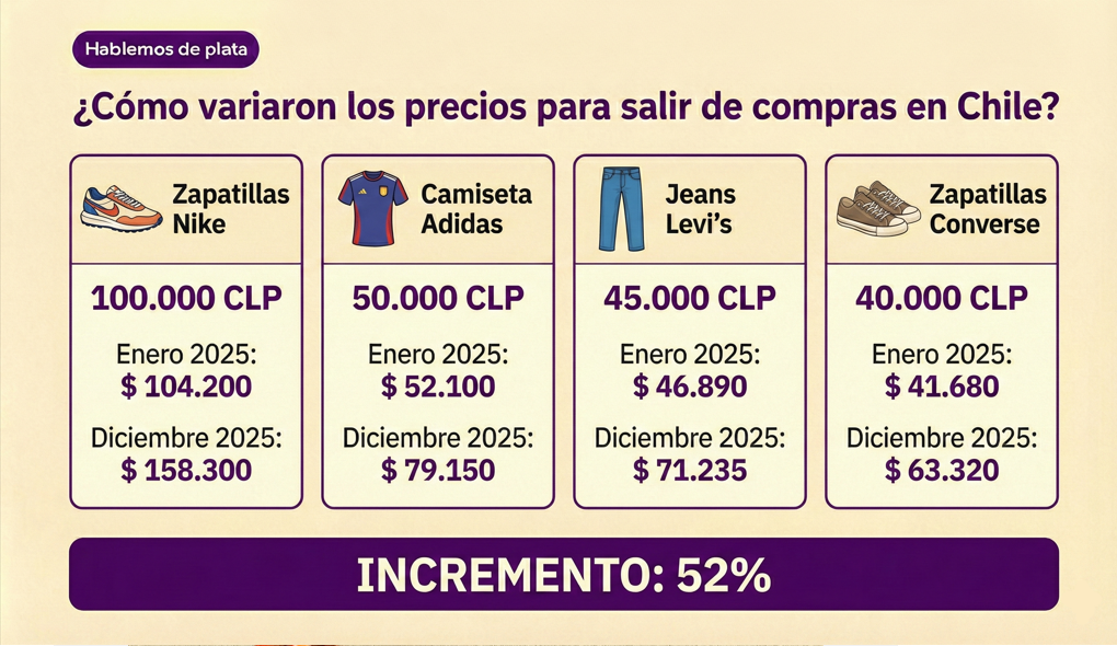 Chile, tradicionalmente elegido para la compra de indumentaria y calzado, tampoco escapó al encarecimiento. El informe de Focus Market muestra que, entre enero y diciembre de 2025, los precios en pesos de productos de consumo masivo aumentaron alrededor del 52%.