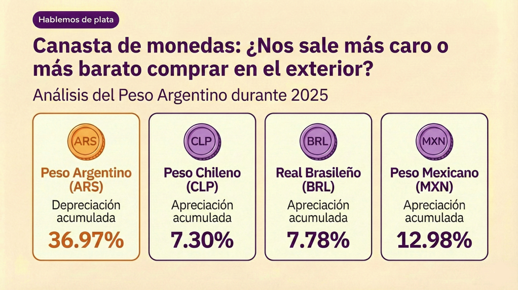En la antesala de las vacaciones de verano 2026, un informe de la consultora Focus Market para el Blog de Educación Financiera de Naranja X analizó la evolución de la denominada “canasta de monedas” y su impacto en el consumo turístico de los argentinos en el exterior. El relevamiento muestra que, como consecuencia de la depreciación del peso argentino durante 2025 y la apreciación de monedas regionales, viajar y comprar fuera del país se volvió significativamente más caro en términos interanuales.