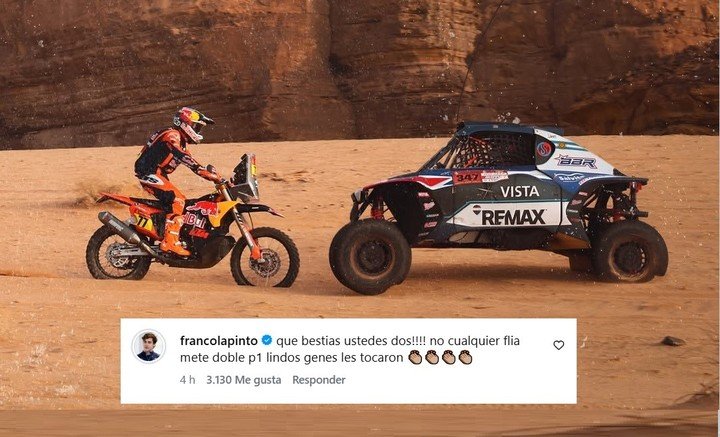 Luciano Benavides esperaba pelear por el Dakar y lo está haciendo. Kevin Benavides buscaba hacer un buen papel en la categoría challenger, después de una vida compitiendo en motos, y lo está logrando. Como cada año, los hermanos llegaron a Arabia Saudita con muchas ilusiones, pero seguro que lo conseguido este domingo no figuraba ni en las más ambiciosas: ganaron sus respectivas etapas, uno en dos ruedas y otro en cuatro, y se convirtieron en los primeros hermanos en triunfar en un mismo día. Entre las felicitaciones, que fueron muchísimas, hubo una muy especial: la de Franco Colapinto.