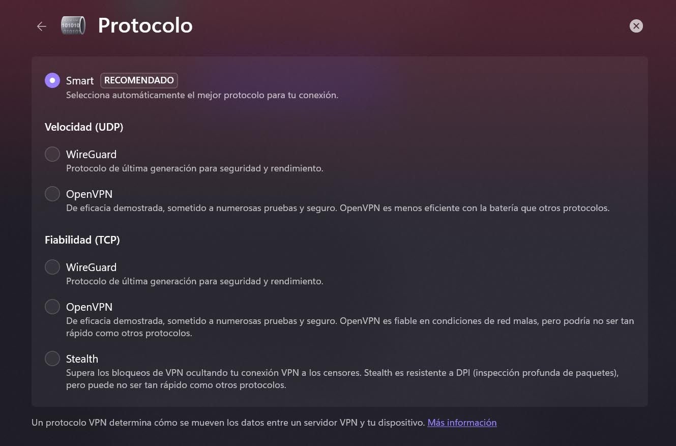 También puedes tener en cuenta la opción de cambiar el protocolo. En muchos casos, la VPN va a permitir que elijas entre varias opciones. Actualmente, los que se consideran más rápidos son WireGuard y OpenVPN. Otro que también está en auge, debido a su velocidad, es el protocolo Lightway.