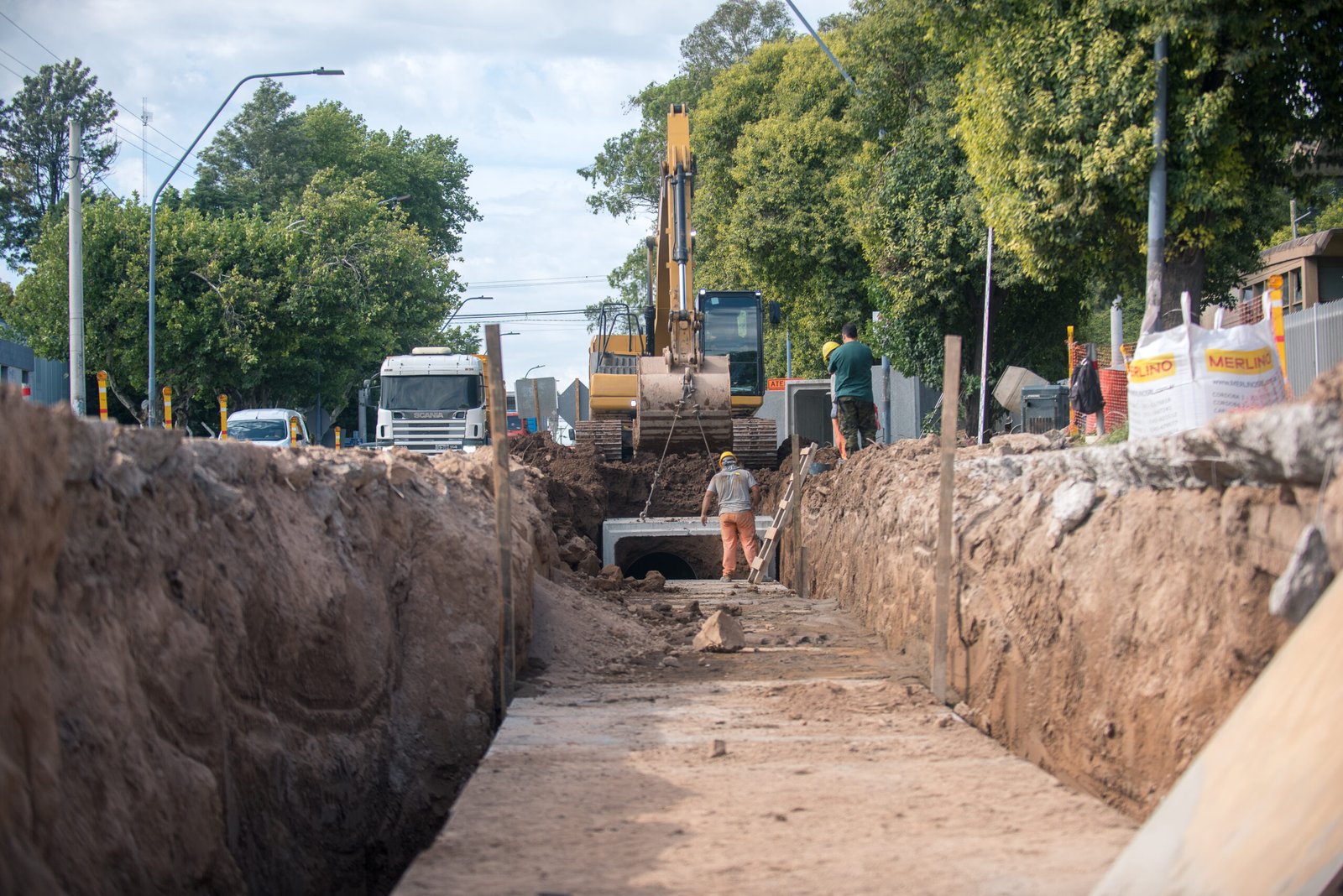 La intervención de 214 metros contempla la instalación de un nuevo conducto de hormigón premoldeado de 2×1.5 metros. Ya se ejecutaron 170 metros del desagüe principal y en los próximos días comenzará la pavimentación y reconstrucción de losas existentes.