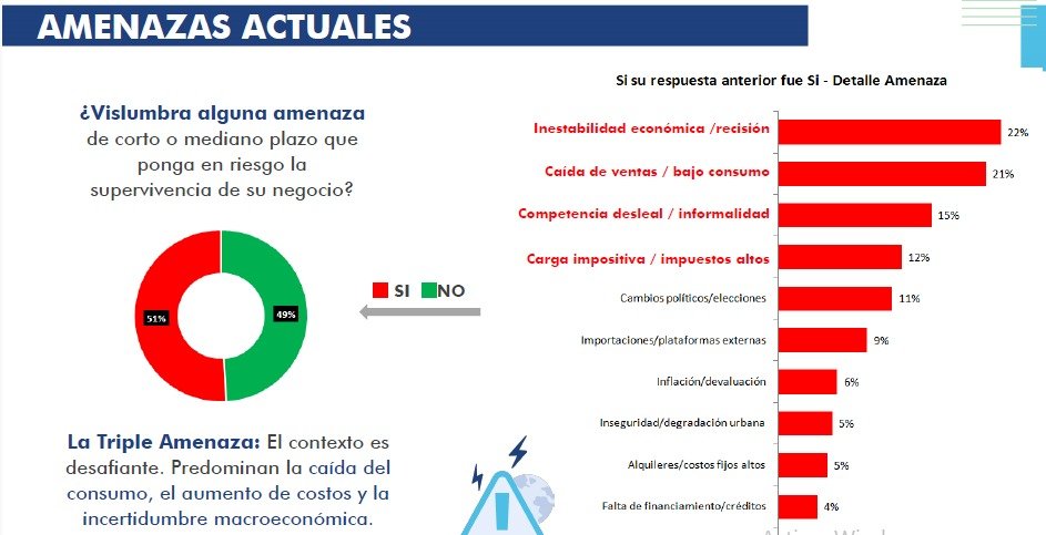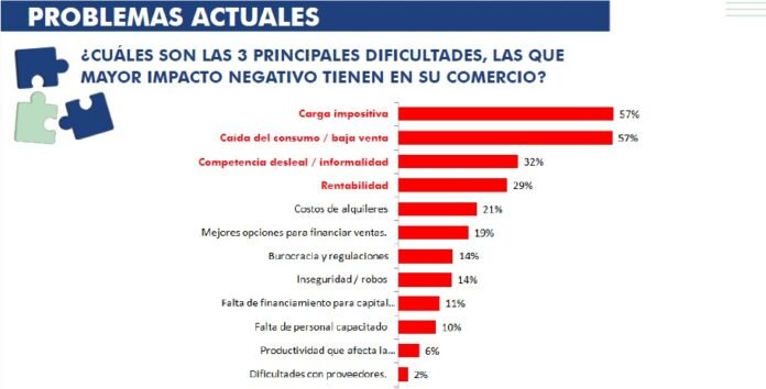 Entre las principales dificultades señaladas por los empresarios aparecen la carga impositiva y la baja en las ventas, ambas mencionadas por el 57% de los consultados, seguidas por la competencia desleal y la informalidad. Estos factores configuran un contexto que condiciona la rentabilidad y limita las decisiones de expansión.