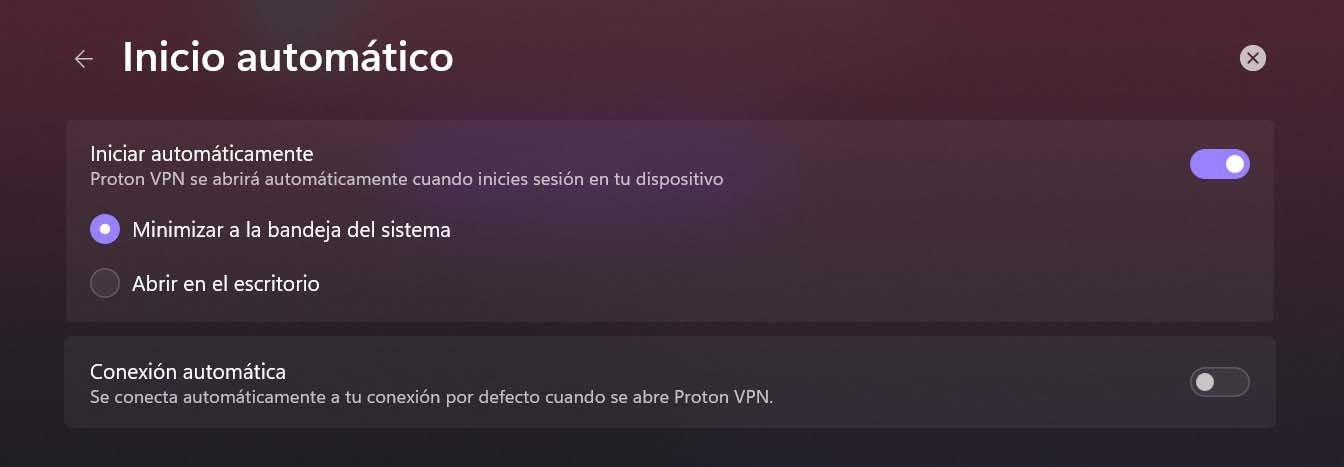 Imagen en la que aparece el menú para iniciar automáticamente Proton VPN