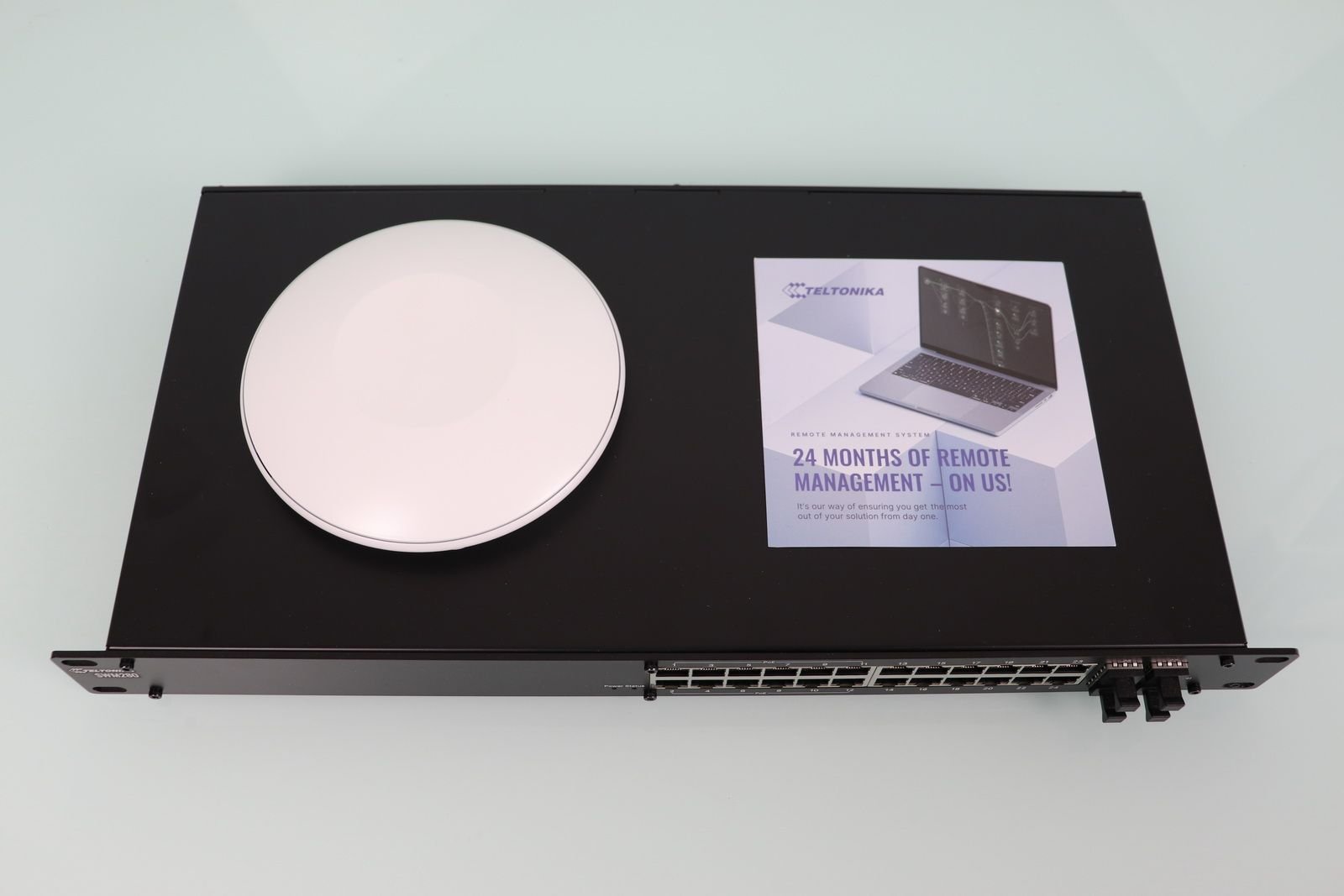 Unboxing del TAP400 junto al switch Teltonika SWM280. Kit de montaje en techo/pared incluido. Foto propia: RedesZone